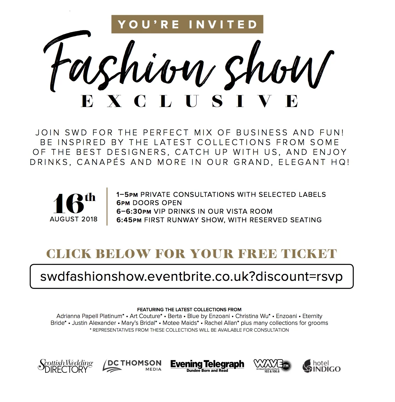 We are back to Dundee to the Iconic Publishing House DC Thompson's HQ for the Scottish Wedding Directory Catwalk Show. A great opportunity to see an exclusive collection of over 30 of our different combinations to help you decide, not to mention the birthplace of the Beano! Free tickets available HERE and we look forward to meeting lots of Brides to be.